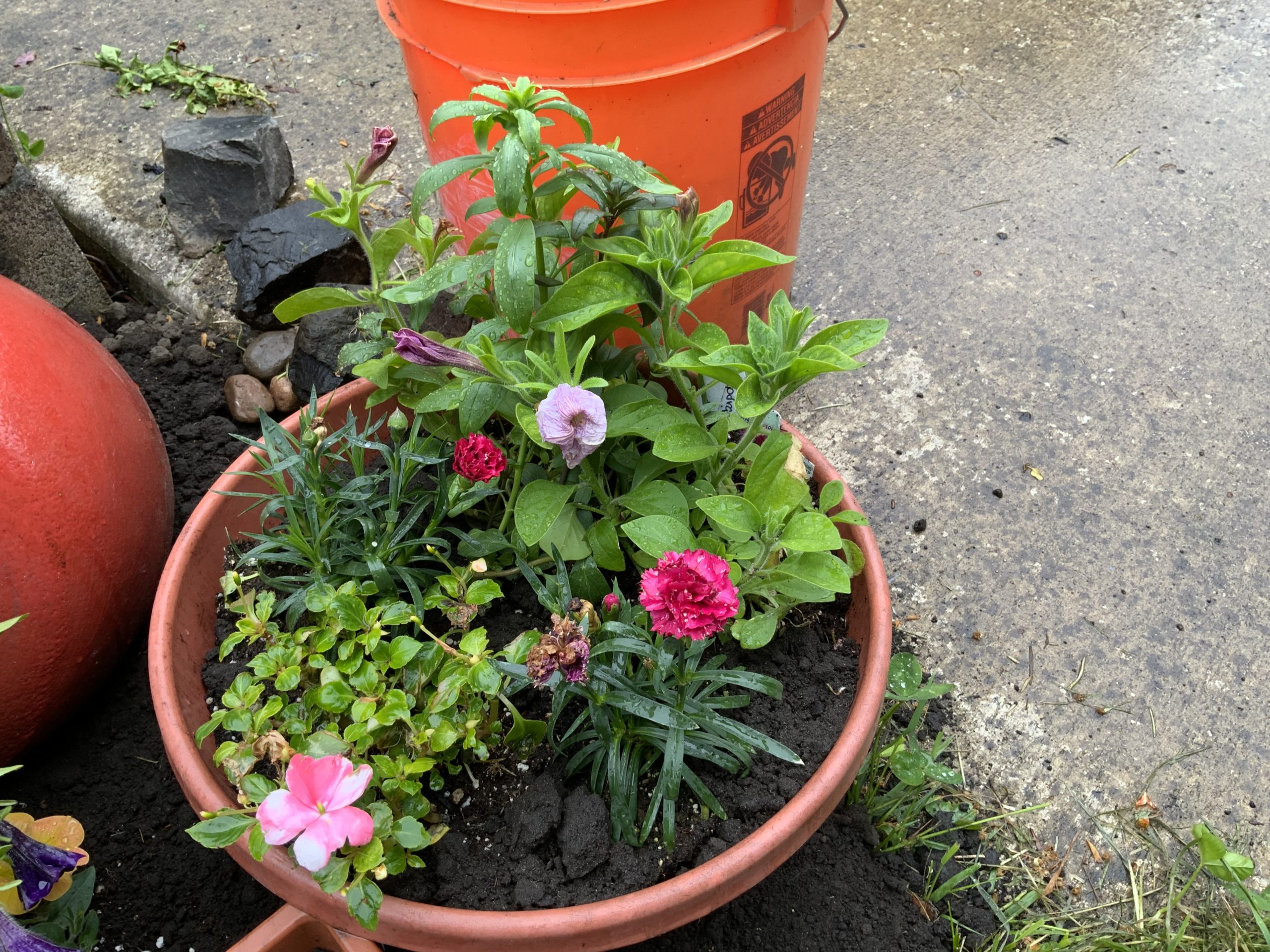 I’ll take some photos of the fully finished look on the next sunny day (which will show off the flowers a lot better), but here are some shots of the before, during, and almost-done back patio.